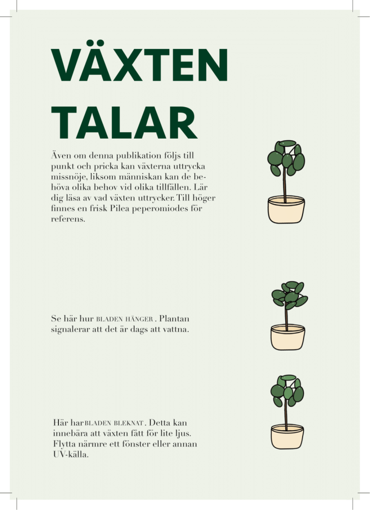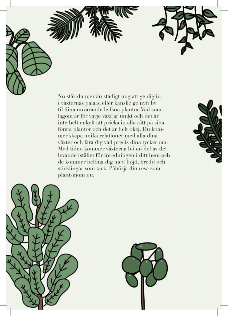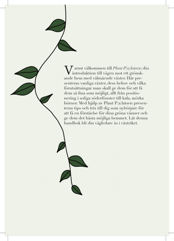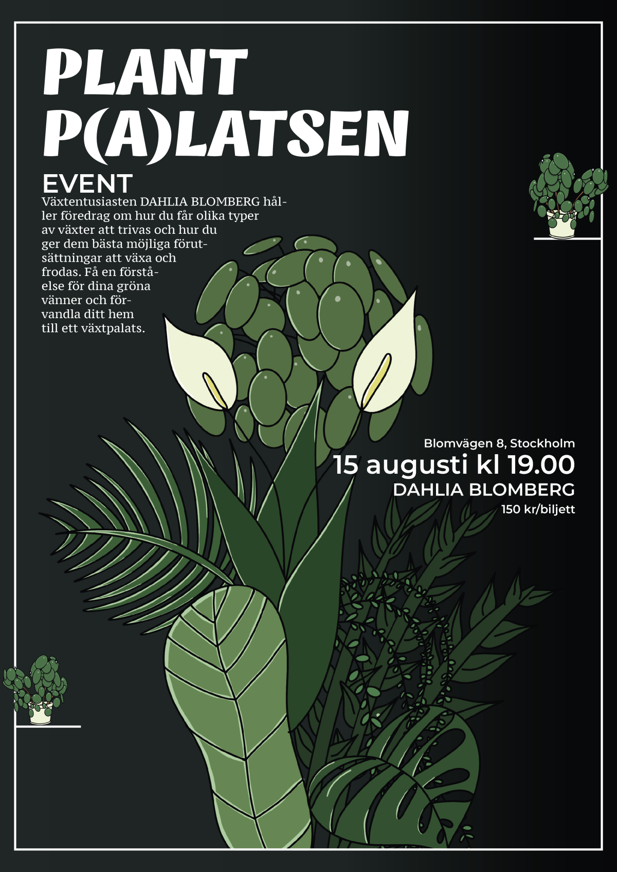 Detta projekt skapades i syfte att utveckla samt hålla ihop en egen större trycksaksproduktion. Jag valde att arbeta med ämnet växter och skapade en publikation för nybörjare i syfte att förstå sig på plantan och dess rätta plats och därmed skapa ett plantpalats i sitt hem. En poster skapades som en förlängning av Plant P(a)latsen och marknadsför ett fiktivt föredrag om det valda ämnet. Affischen hämtar visuella element från publikationen och de går i linje med varandra. I detta projekt skapades de visuella elementen i Procreate på iPad, detta för att fritt kunna skapa med en naturlig känsla.